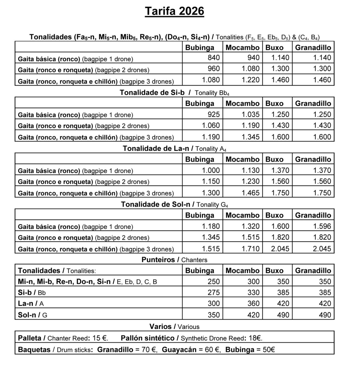 En esta hoja se puede ver las gaitas y repuestos que tenemos para entrega inmediata.